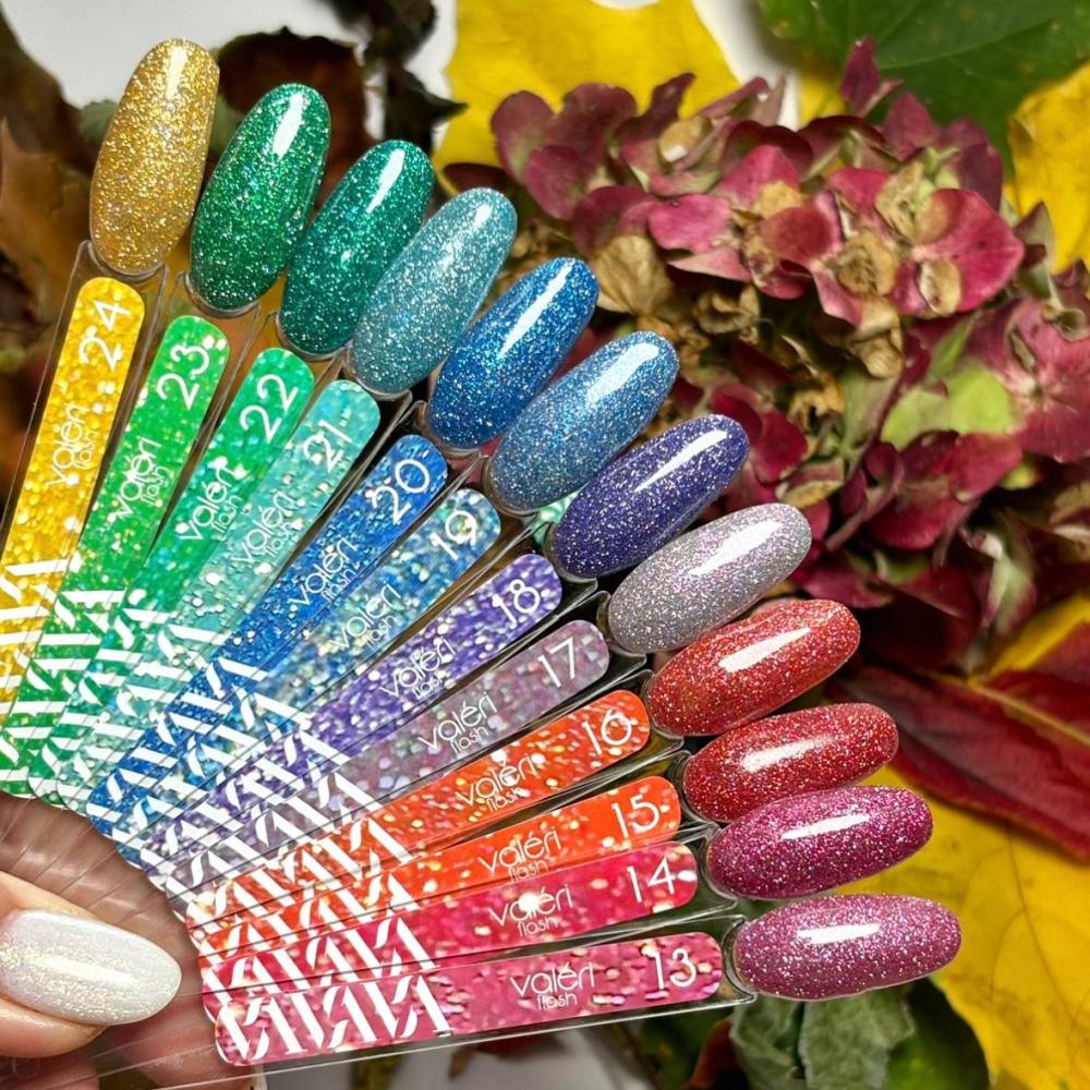 Гель-лаки Valeri Flash не тьмяніють, а покриття тримається довго без сколів і тріщин. Гель-лаки зручні в нанесенні та самовирівнюються по нігтьовій пластині.